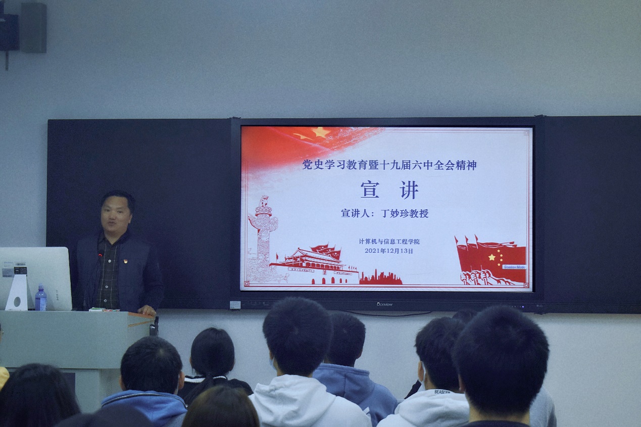 1213日下午,学校党史教育宣讲团丁妙珍教授来计算机与信息工程学院做党的十九届六中全会精神专题宣讲报告。计算机学院党总支书记张宁主持宣讲会,计算机学院师生代表参加。