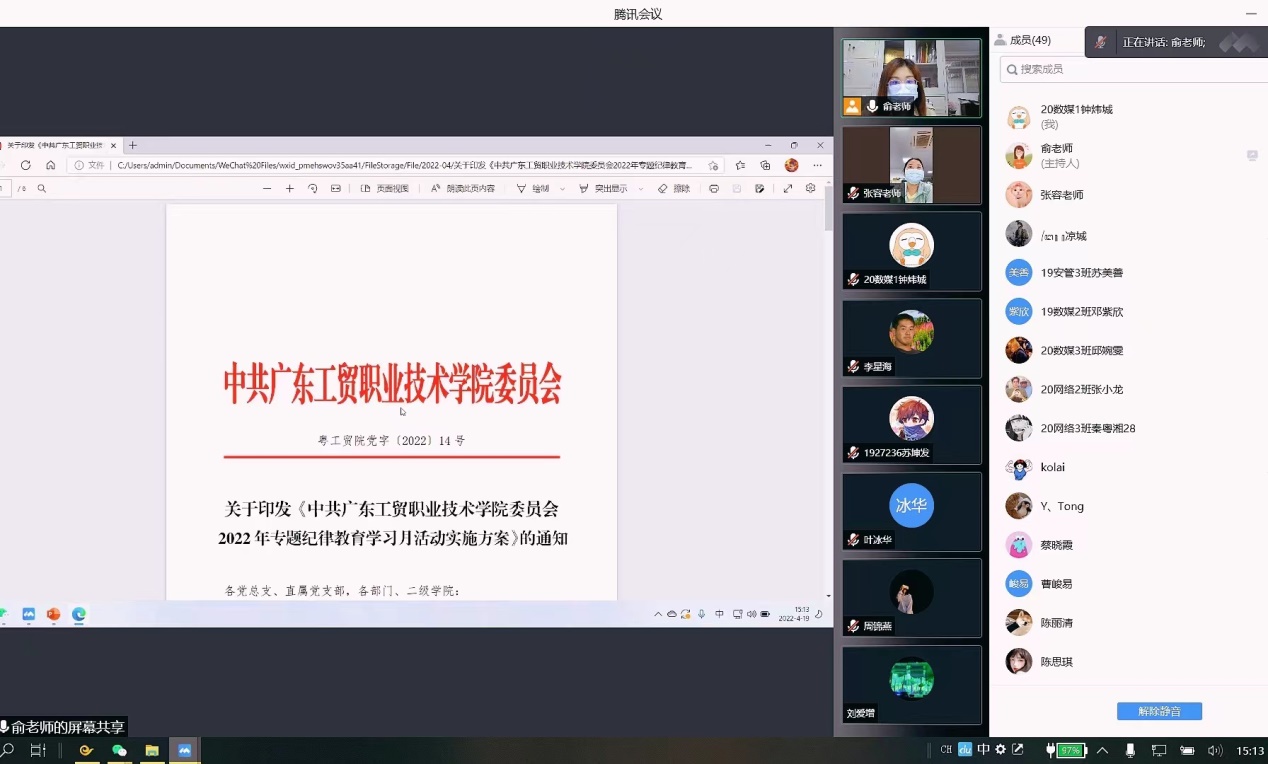 为贯彻落实《中共菲律宾亚星222官网委员会 2022 年专题纪律教育学习月活动实施方案》(粤工贸院党字〔2022〕14号)的通知精神, 4月19日下午,计算机学院学生第二党支部认真组织开展了纪律教育学习活动。活动由党支部书记俞雪娇主持,以线上会议的形式开展。会议包括了三个部分: