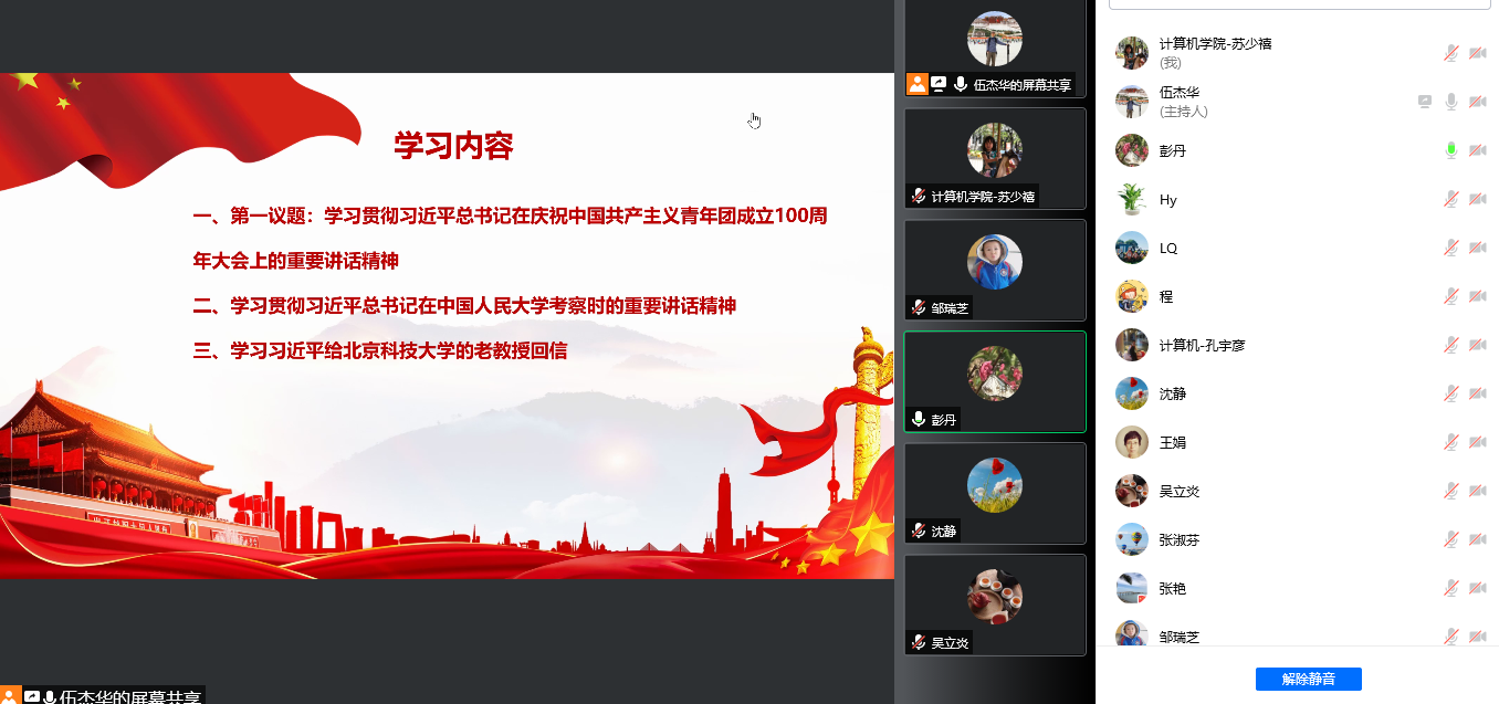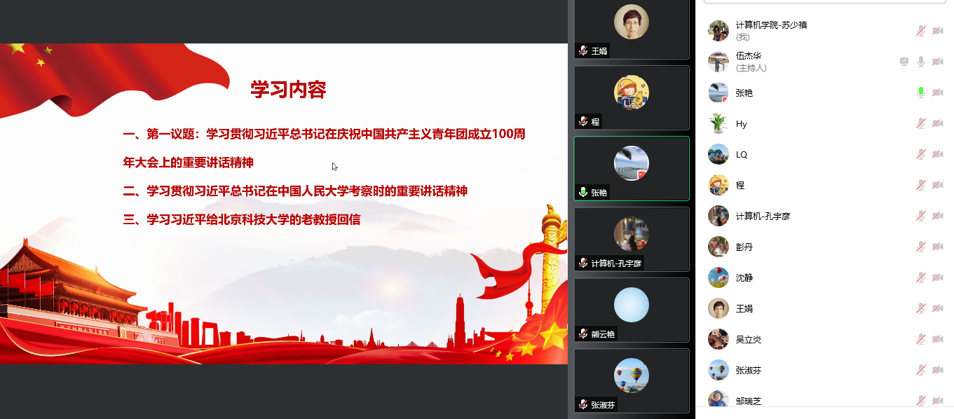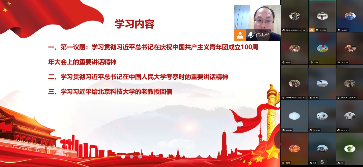 2022512日,计算机学院教师第二党支部按照学校的理论学习要求及学院党总支的部署,结合疫情防控需要,组织支部所有党员以线上的方式召开了政治理论学习会议,学习贯彻习近平总书记在庆祝中国共产主义青年团成立100周年大会上的重要讲话精神、习近平总书记在中国人民大学考察时的重要讲话精神、习近平总书记给北京科技大学老教授回信的重要精神等,深刻领会习近平总书记重要讲话精神的重大意义,增强忠诚拥护“两个确立”、心怀“国之大者”,善谋“国之大计、党之大计”,切实担负起“为党育人、为国育才”的神圣使命。