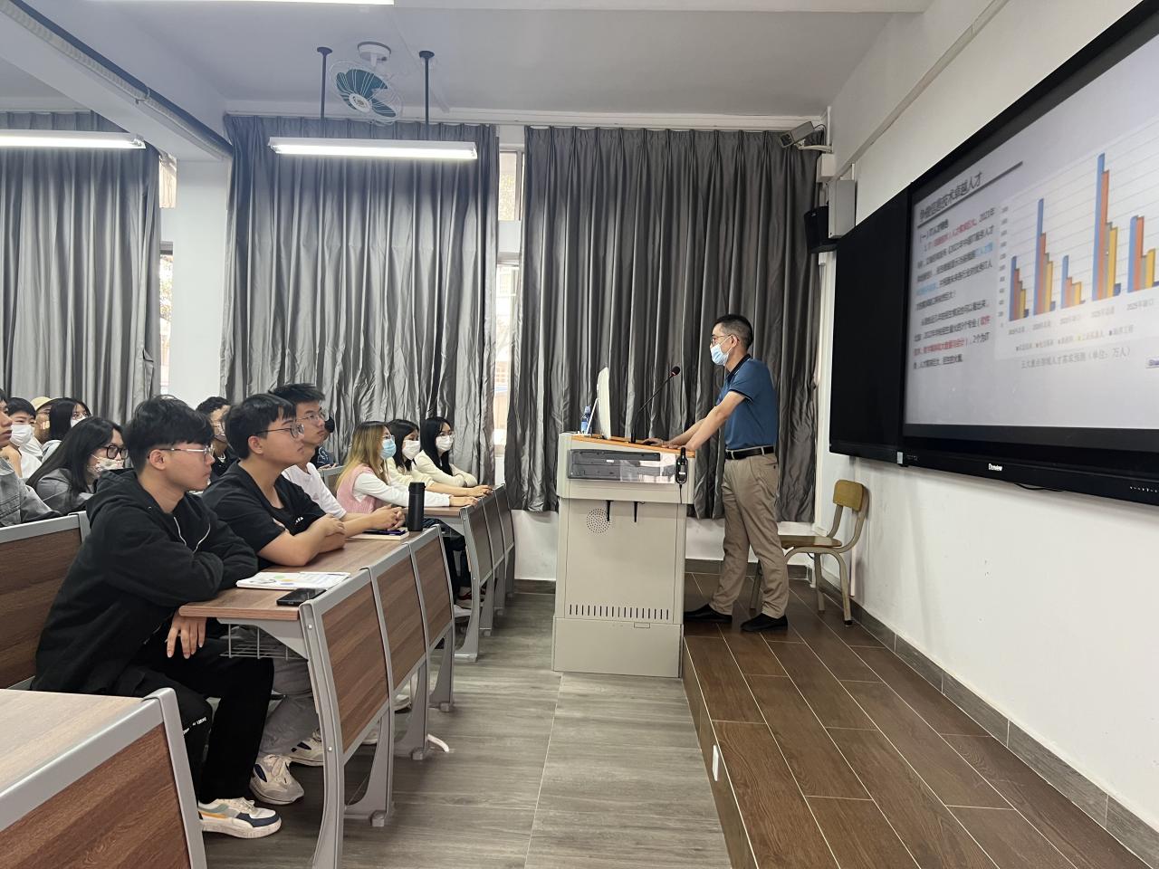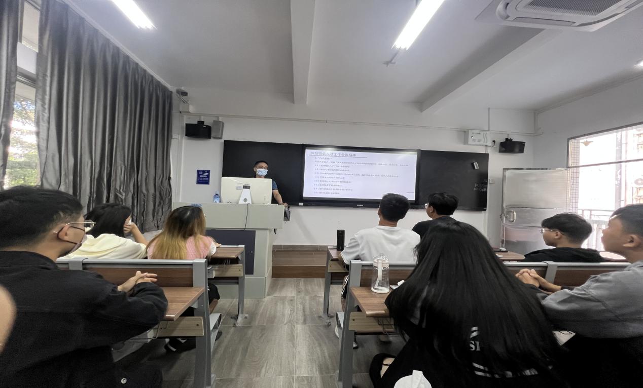 课上,余棉水主要就深刻领会中央人才工作会议精神、争做信息技术卓越人才两方面展开介绍。首先提到了习近平总书记在2021年9月27日至28日在北京召开的中央人才会议中讲到的“人才,乃强国之根本,兴邦之大计”。接着,分别提到了“八个坚持”、一个重要战略目标、大力培养使用战略科学家、打造大批一流科技领军人才和创新团队、谈培才引才用才这五个方面给同学们进行更加深入的人才工作介绍。以北斗导航系统为例,让同学们进一步了解“大力培养使用战略科学家”,要根据自己的实际情况,有长远的规划意识。