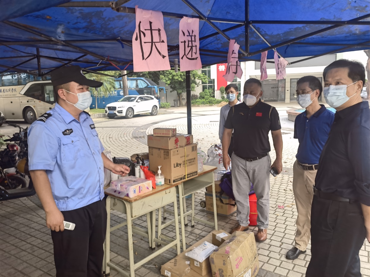 何校长一行首先检查了西区的健康观察房,随后来到了天河东区门岗,和值班的保安人员了解了出入门口的管控情况以及临时快递存放点的消毒工作。紧接着,何校长偕同各部门查看了实训楼、教学楼、篮球场核酸监测点、校园小超市等场所,了解学生在校园的学习生活情况,以及各项工作是否严格执行了疫情防控的相关规定。