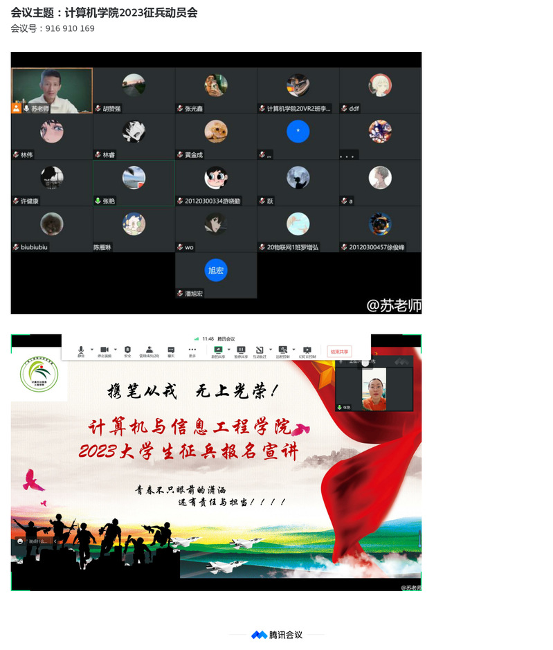 当前,各地春季征兵正在如火如荼的进行。为响应国家号召,鼓励更多大学生投身军营,计算机学院于1月13日晚举行了2023届毕业生征兵线上动员会。计算机学院党总支副书记张艳参加了会议并讲话。