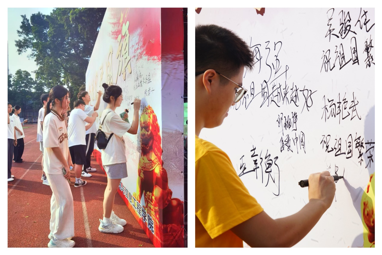 当国旗升起时,全体师生精神饱满,庄严肃穆。当同学们共同唱响《我和我的祖国》时,家国情怀在歌声中流淌,个人与祖国同呼吸共命运的情感在天河校区回响。活动结束后,师生们怀着激动的心情,在展板上留下了对祖国的祝福,情愫奔涌,笔尖流动出了大家心中的祝福以及对美好未来的向往。