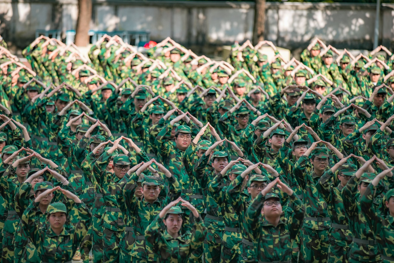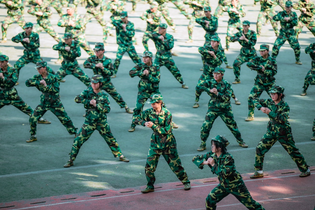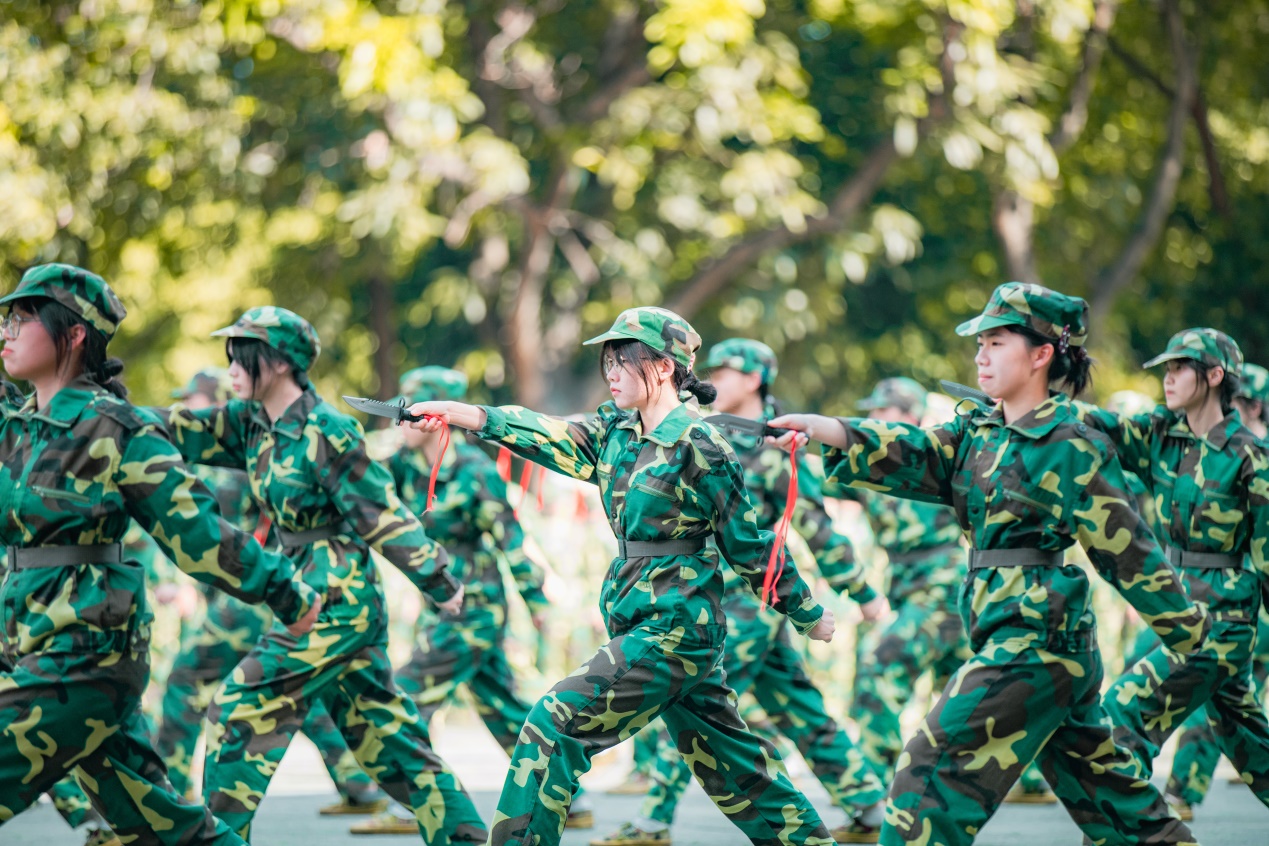 教官严肃认真地教学生们军姿站立、敬礼手势、正步走和行列齐走等系列规范动作。学生们在教官的口令下迅速做出相应的动作,展现出了该有的士气和坚定。