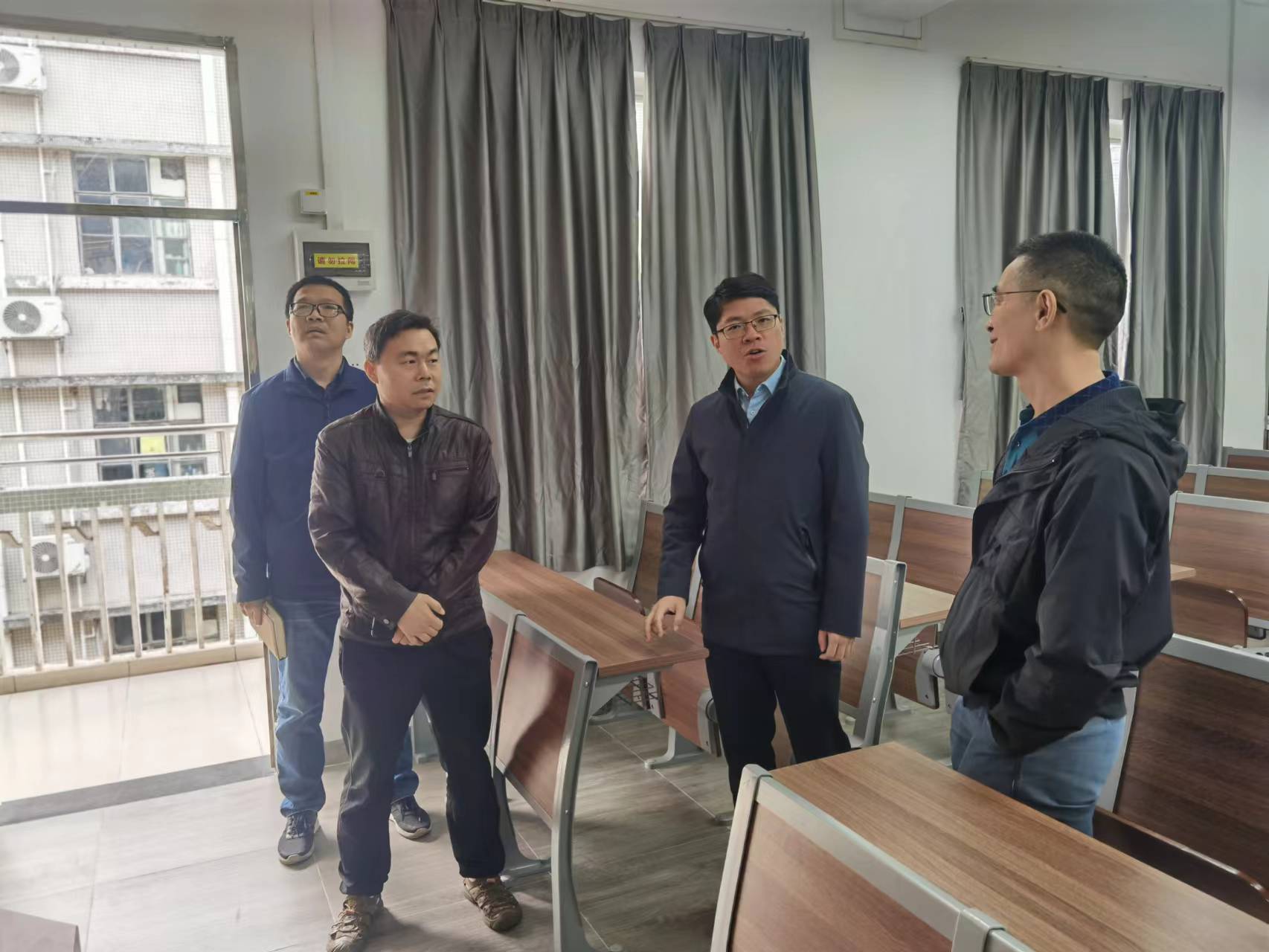 首先,徐勇军走访了天河校区教学楼和实训楼等教学场所,了解了计算机学院教学情况与学生管理工作情况。走访后,徐勇军和计算机学院领导班子在天河校区教学楼104会议室就计算机学院建设展开了研讨,张宁就学院党建、学生思想政治工作做了汇报,余棉水就学院基本情况、存在问题和未来设想做了汇报,单家凌就学院的教学工作进行了汇报,鲁庆就学院的校企合作、实训室建设等方面进行了汇报。
