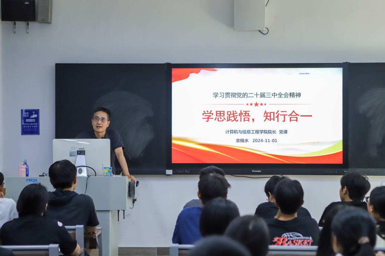 为深入学习贯彻党的二十届三中全会精神,进一步落实立德树人根本任务,加强学生的思想政治教育,激发学生的爱国情怀和社会责任感。11月1日下午15:00,计算机与信息工程学院院长余棉水在天河校区教学楼103为入党积极分子们带来了以“学思践悟,知行合一”为主题的“院长第一课”。