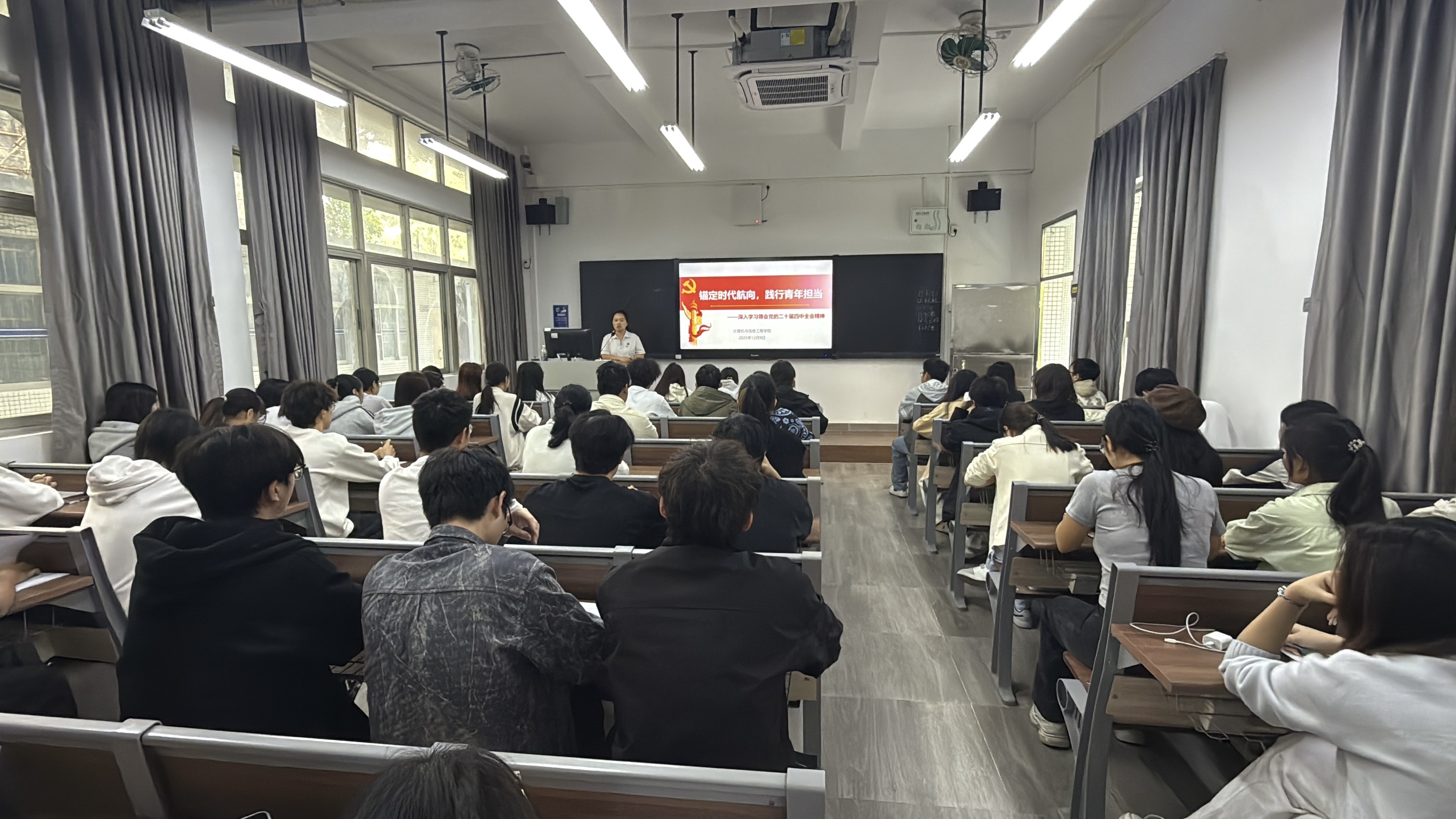 为深入学习贯彻党的二十届四中全会精神,切实推动全会精神在青年群体中落地生根,12月9日,计算机与信息工程学院在教学楼102室面向全体团学骨干开展了党的二十届四中全会精神宣讲活动。本次宣讲由辅导员蒋利君主讲,以《锚定时代航向,践行青年担当》为主题,旨在筑牢基层团干部思想根基、强化责任担当,为学院学生工作高质量发展注入青春动能。