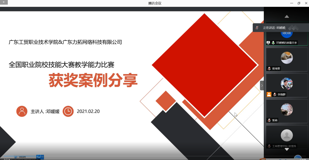 为全面提升教师教学能力,备战2021年全国和省级职业院校教学能力比赛,2月20日晚,我校邀请广东力拓网络科技有限公司视频事业部总监邓媛媛,为我校教师分享全国教学能力比赛国赛获奖案例,各教学单位专任教师共计200余人参会。
