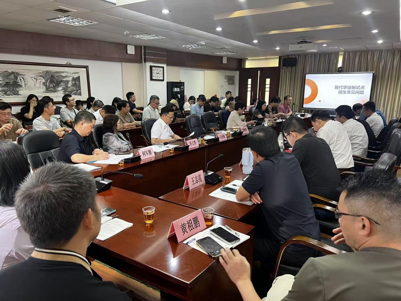 会议由教务部部长何军拥主持。学校党委委员、副校长徐勇军出席会议并发表重要讲话。徐勇军指出,现代学徒制是深化产教融合、校企合作的重要途径,是推动职业教育内涵式发展的关键举措,对于创新技术技能人才培养模式具有重大意义。徐勇军要求全体与会人员高度重视,凝聚校企合力,力争在试点申报中取得新突破,为学校高质量发展注入新动能。