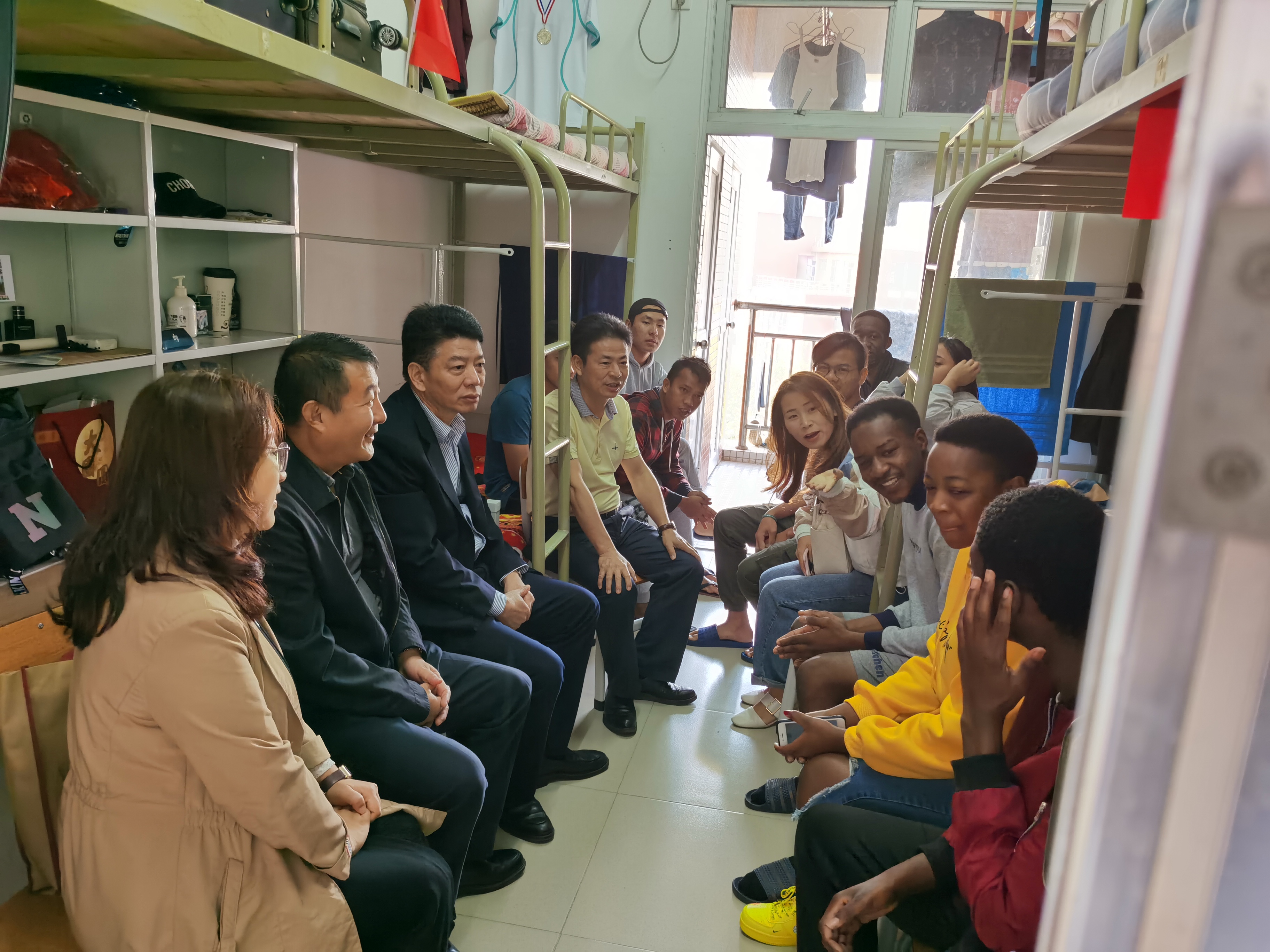 2019年11月23日,学校党委书记汤才,有色金属工业人才中心党委书记、总经理谢承杰等来到“一带一路”留学生宿舍,关心探望留学生并亲切交谈。学校党委委员、副校长陈珊兴,有色金属工业人才中心教育培训处副处长祝丽华,学校党委委员、党办主任黄雄志、学校办副主任苏文杰、机电工程学院辅导员邵盼盼等参加座谈会。