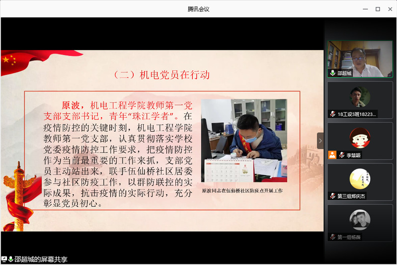 7月6日晚上20点,机电工程学院党总支书记邵超城同志线上为机电工程学院党总支2020年上半年发展对象讲授了一堂以“感悟中华力量,强化使命担当”为专题的思政“第一课”。