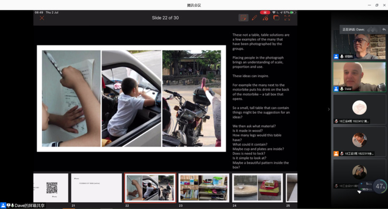工作坊于2020年6月29号举行了网络开课仪式,徐勇军院长致欢迎辞并对前3届工作坊做了回顾(图1),对同学们的学习提出了相关要求。接着David Bramston教授和邱登科教授做了“设计灵感的来源”为主题的开课讲座(图2-图4)。David Bramston教授将自身的经验授予同学们,如何正确理解Upcycling、认识材料、感知材料,用幽默的语言、渊博的知识、生动的讲解激发了同学们对设计的重新认识以及更加深层次的热爱。