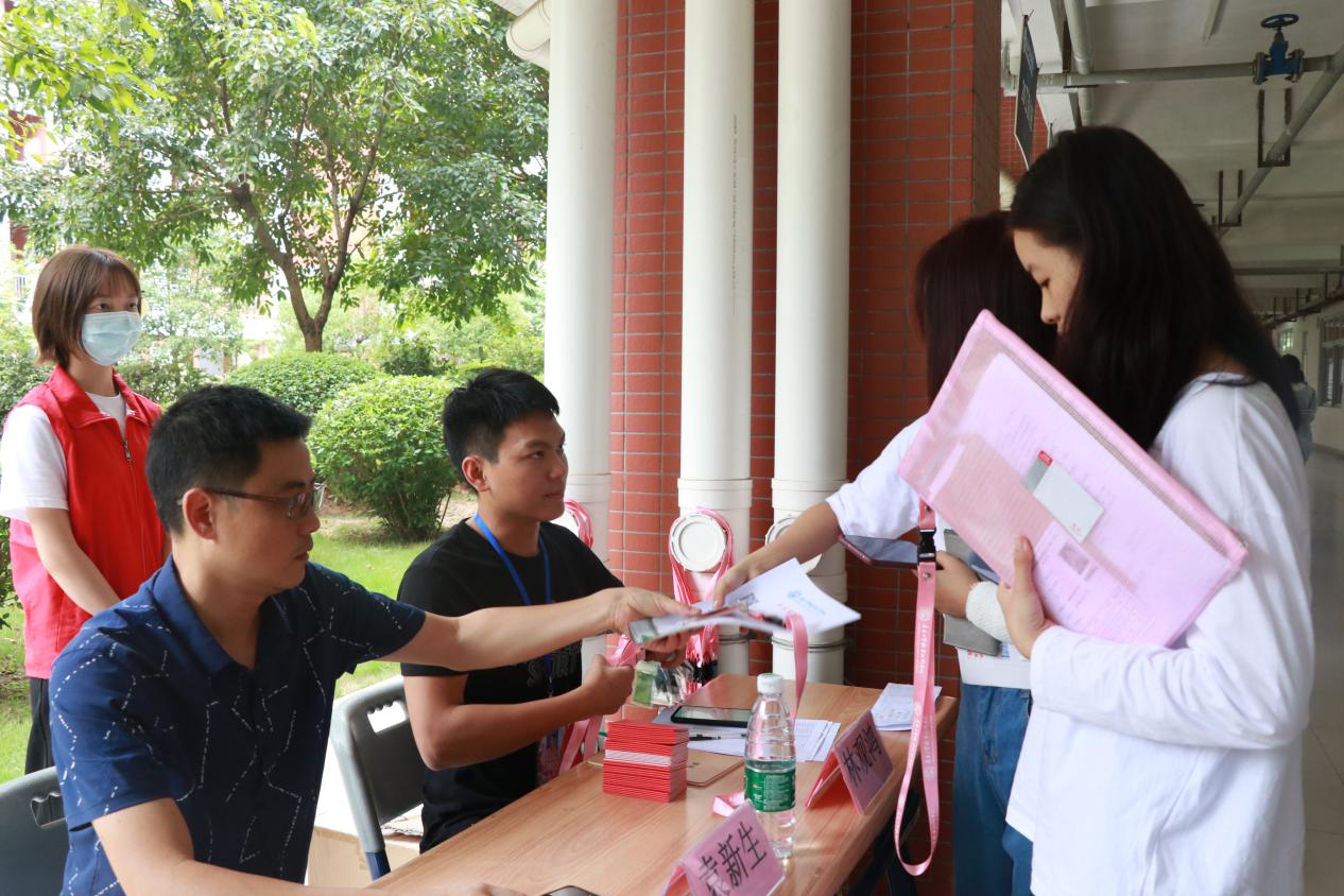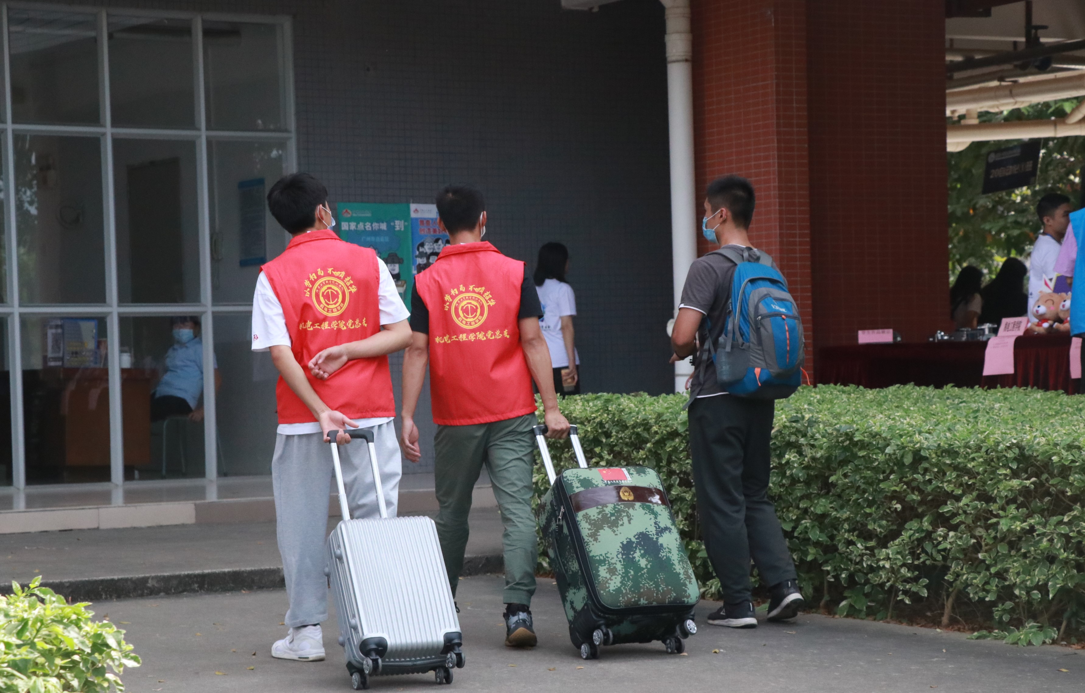 为了做好迎接新生服务工作,穿着红色马甲的志愿者们,早上7点就在接待点等候迎接新生。在疫情防控期间,家长们只能送学生到学校门口,新生在学校门口核验身份和行李消毒后进入学校。在新生达到后志愿者们迅速帮助新生把行李贴好标签寄存好,并陪同乘坐校内接驳车到宿舍区办理入住手续,再前往迎新注册现场报到。尽管天气炎热,志愿者还是热情高涨,不辞辛劳有条不紊的引领新生完成报到的所有程序。
