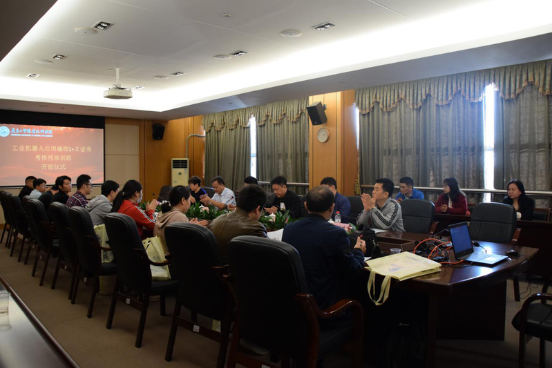 11月27日在我校白云校区举行了开班仪式,学校副校长唐毓秋、继续教育院长朱永平、机电学院领导班子邵超城、徐勇军、游凯、北京赛育达公司马雪峰教授、校外专家莫胜撼教授及各位参培学员参与了开班仪式。会上唐校长肯定了我校的培训工作,也对此次承担着组织评价机构与广东省16所院校“工业机器人应用编程”1+X技能等级证书试点院校的沟通和管理工作进行了合理安排,并对下一步我校积极组织“工业机器人应用编程”1+X技能等级证书师,资培训班、学生培训与考证工作进行了部署,赛育达公司马雪峰教授随后也做了重要发言和培训的相关安排,学员代表宋显文老师也代表43位参训老师做了发言。