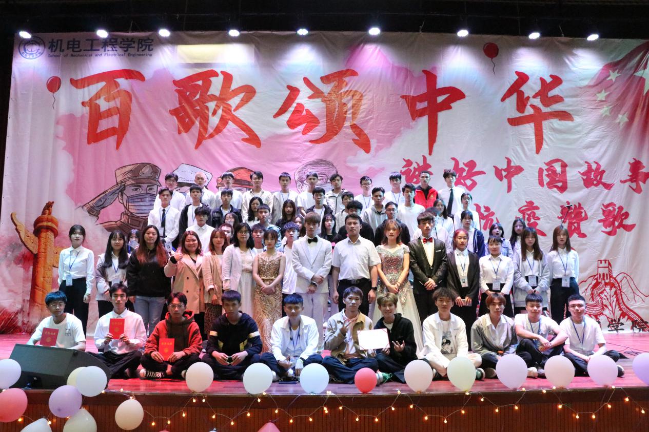 在主持人的介绍下,各个班级陆续登上属于他们的舞台,舞台上亮眼的聚光灯一齐照向机电工程学院学子们,随着音乐声的响起,同学们那激昂豪迈、催人奋进的乐曲围绕在本场观众的耳边。他们唱出最后一击的歌声,因为他们知道,这次的机会是在他们反复练习后,最后一次爆发的机会,唱出最好的一次。在这次的活动中有些班级十分有创意,统一的班服,整齐划一的手势,在无形之中带动了现场的氛围,使观众沉迷于他们的激情彭拜的歌声之中。有些班级的口号也是起得相当的气势磅礴,充满着斗志蓬勃。这一点一滴无不在显示着机电工程学院学子们背后为了本次活动所做的充足准备,在精彩的声音对决中,比赛不知不觉接近尾声。最后以飞久音乐社唱出的一首“一路向北”结束了本届百歌颂中华,接着以颁奖为环节,使本次活动完美落下帷幕。