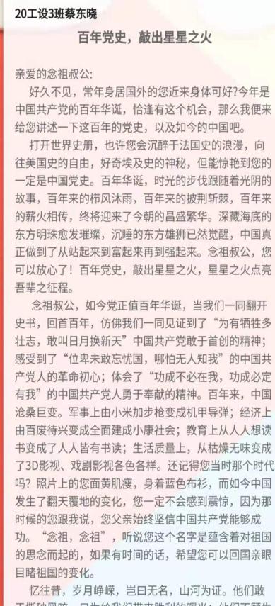 “我给亲人讲党史”主题征文活动作品,充分展贤现了当代大学生青年当好红色基因的传承人的精神。本次活动引导当代大学生青年全面了解、正确认识党的光荣历史、伟大成就、宝贵经验、革命传统和优良作风,坚定跟党走中国特色社会主义道路的信念,树立报效祖国的远大理想,用信仰之力开创美好未来,在全面建设社会主义现代化国家新征程中书写青春华章。
