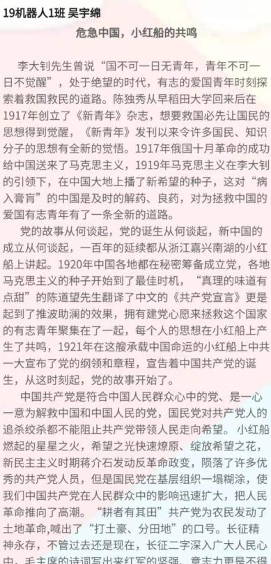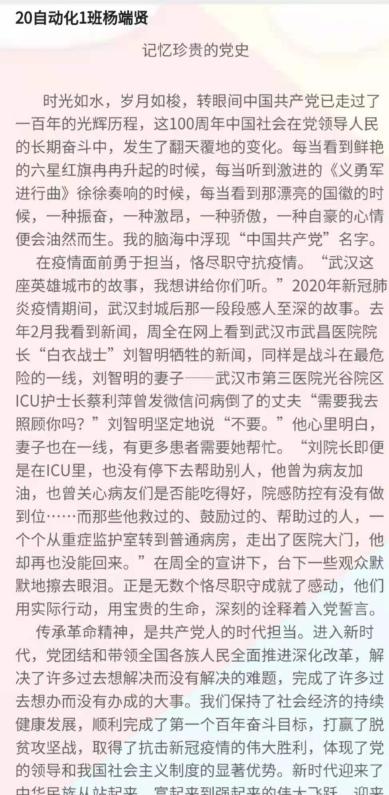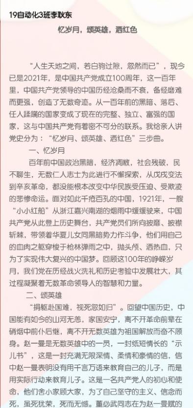 经过公平、公正的评审,此次活动共评选出一等奖1名:20数控3班的陈美欣《父亲与党的故事》;二等奖2名:20工设3班的蔡东晓《百年党史,敲出星星之火》,19机器人1班的吴宇绵《危急中国,小红船的共鸣》;三等奖3名:20自动化1班的杨端贤《记忆珍贵的党史》,19自动化3班的李耿东《忆岁月,颂英雄,洒红色》,20工设3班的张双蓉 《忆党峥嵘,担青年使命》,以及参与奖若干。