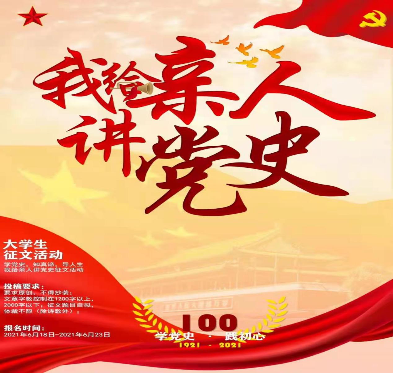 为隆重庆祝中国共产党成立100周年,讴歌中国共产党领导中国革命和建设取得的伟大成就,铭记党的历史,发扬党的优良传统,深入学习习近平总书记关于学习党史的重要论述,配合我校党史学习教育全覆盖,号召全体党员和学生学党史传承红色基因、悟思想坚定理想信念。机电工程学院党总支主办、机电工程学院学生党支部承办的“我给亲人讲党史”主题征文活动于6月正式启动。本次活动面向机电工程学院全体学生。