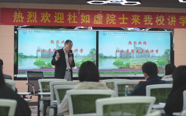 随后在行知楼604,开展了一场精彩的交流活动,首先由刘贻新副校长介绍了我校的历史和近期发展,以及学校的重点院系、项目,并向杜院士的到来表示诚挚欢迎。接着,杜院士向我校师生做了一场别具一格的讲座。