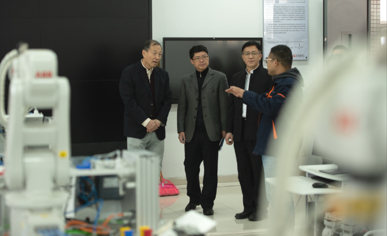 杜院士依次参观了机电工程学院的智能制造单元、工业机器人自动生产线、工业机器人系统集成、高速与多轴加工、智能制造理实一体化等多个实训室,听了实验员的介绍,对我校硬件条件和开展的项目表示赞赏。