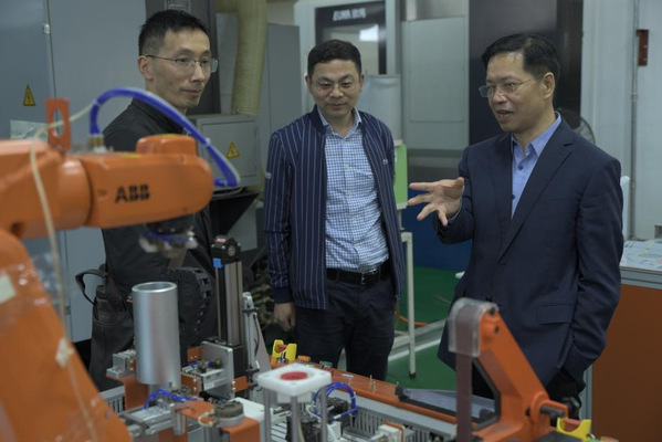 会后何汉武、徐勇军、张永康等一行人员在广东工贸行知楼参观和考察了机电工程学院实训室,就“法国施耐德项目”进一步交流沟通,分享经验。邵超城、唐建伟等一行人员在明德楼二楼机电工程学院样板党支部活动室参观和考察党建活动室,就党建工作、学生工作进一步交流沟通,分享经验,最后合影留念。
