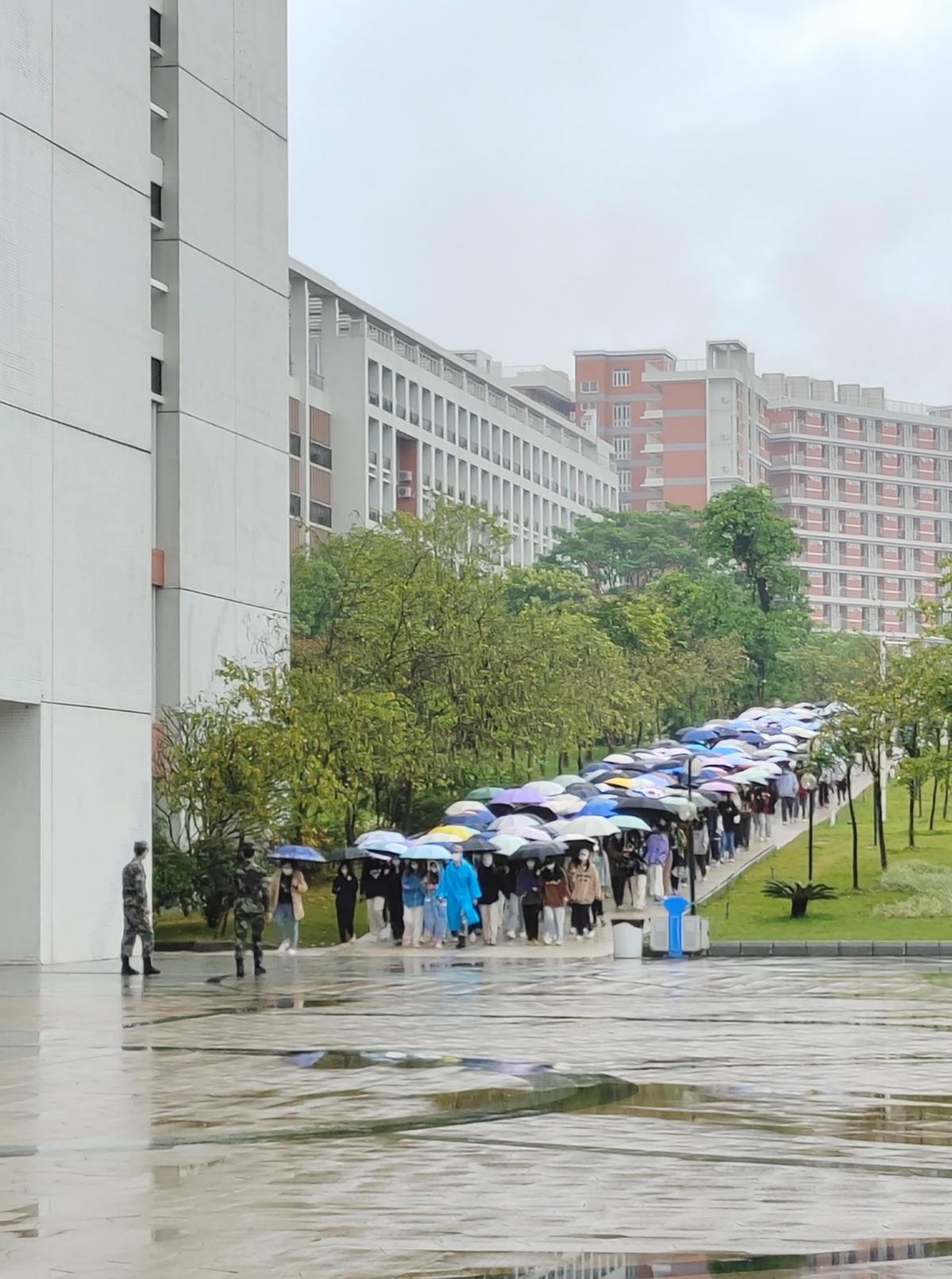 为促使此次检测活动有序进行,医护人员身穿防护服、冒雨前行赶到现场做准备工作,全体师生在退伍军人的指引下按照“分栋模式”有序排队集合,志愿者耐心引导受检师生严格按照疫情防控要求,佩戴好口罩、测温、出示健康码和核酸码,保持1米的间隔排队等候,医护人员反复进行试管贴签、消毒洗手、采集咽拭子、现场采样装管等规范操作,现场秩序井然。