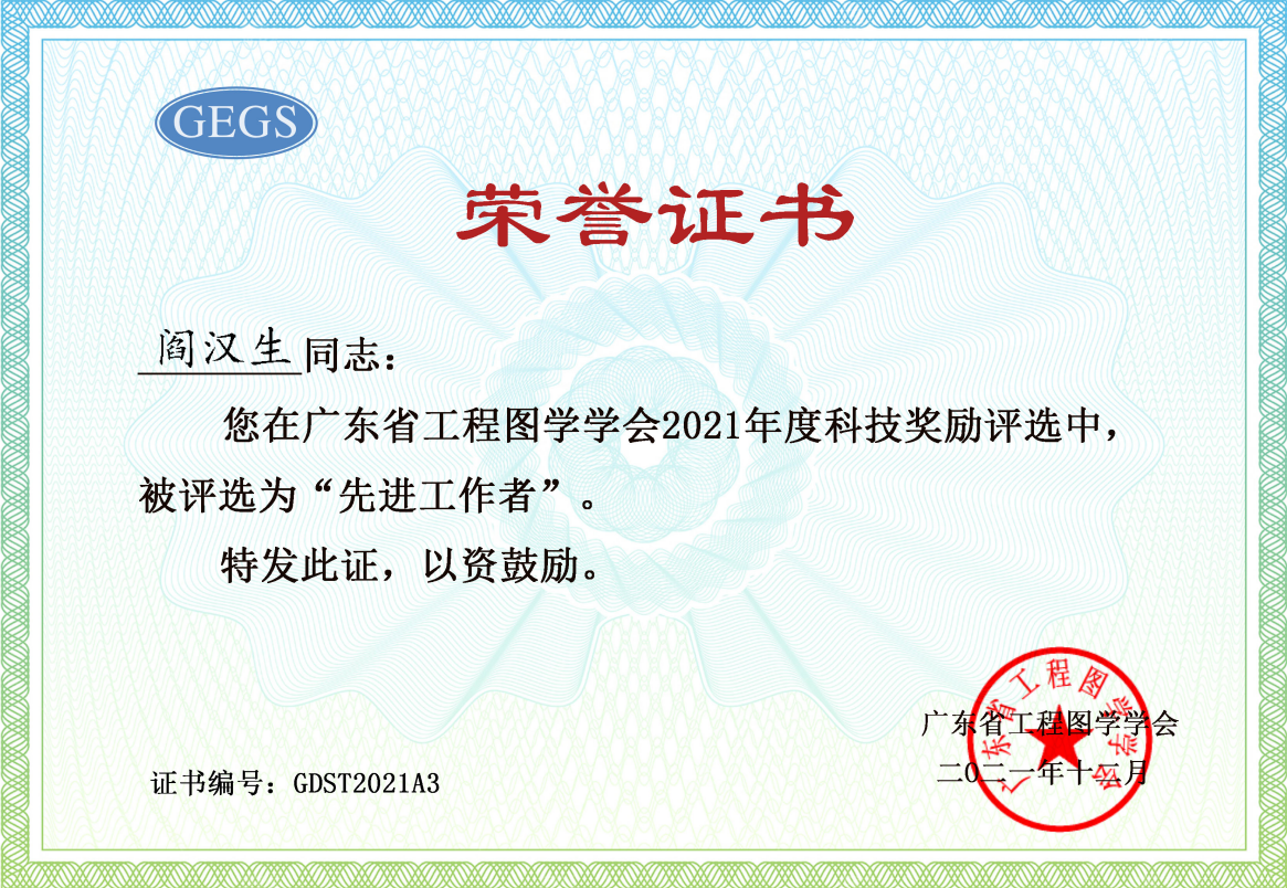 4 | 广东省工程图学会2021年度科技奖励-“先进工作者” | 省级学会奖励 | 2021.12 | 阎汉生 |