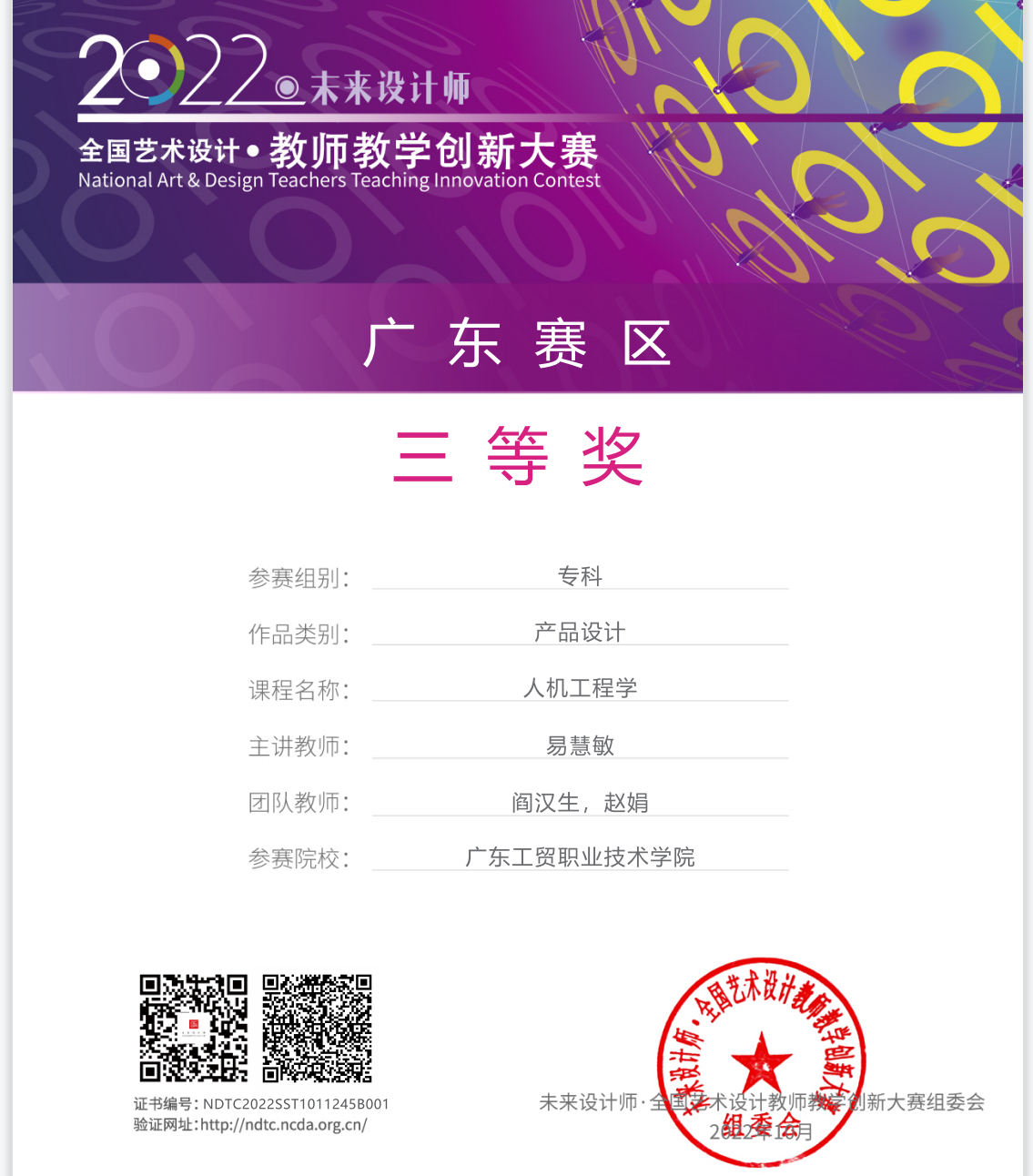 2 | 未来设计师•艺术设计教师教学创新大赛 | 2022年广东赛区三等奖 | 2022.11 | 易慧敏、阎汉生、赵娟 |