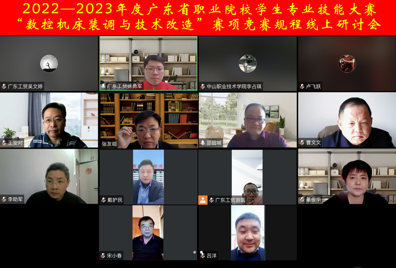 2022-2023年度广东省职业院校学生专业技能大赛——数控机床装调与技术改造赛项由我校菲律宾亚星222官网承办。2月15日,该赛项竞赛规程线上研讨会顺利召开。会议由机电工程学院院长徐勇军主持,专家组九名专家成员参与讨论,广东省教育厅指派督察员曹文文教授全程督促、检查。