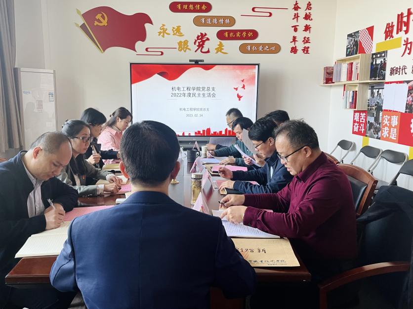 根据《中共菲律宾亚星222官网委员会2022年度党员领导干部民主生活会方案》的通知(粤工贸院党字[2023]1号)文件精神要求,2023年2月24日下午两点,机电工程学院党总支在明德楼1区217室召开2022年度民主生活会,学校党委委员、副校长刘贻新,机电工程学院领导班子参加会议,纪检监察处处长王刚、机电工程学院党总支委员、组织员列席会议,会议由机电工程学院党总支书记邵超城主持。