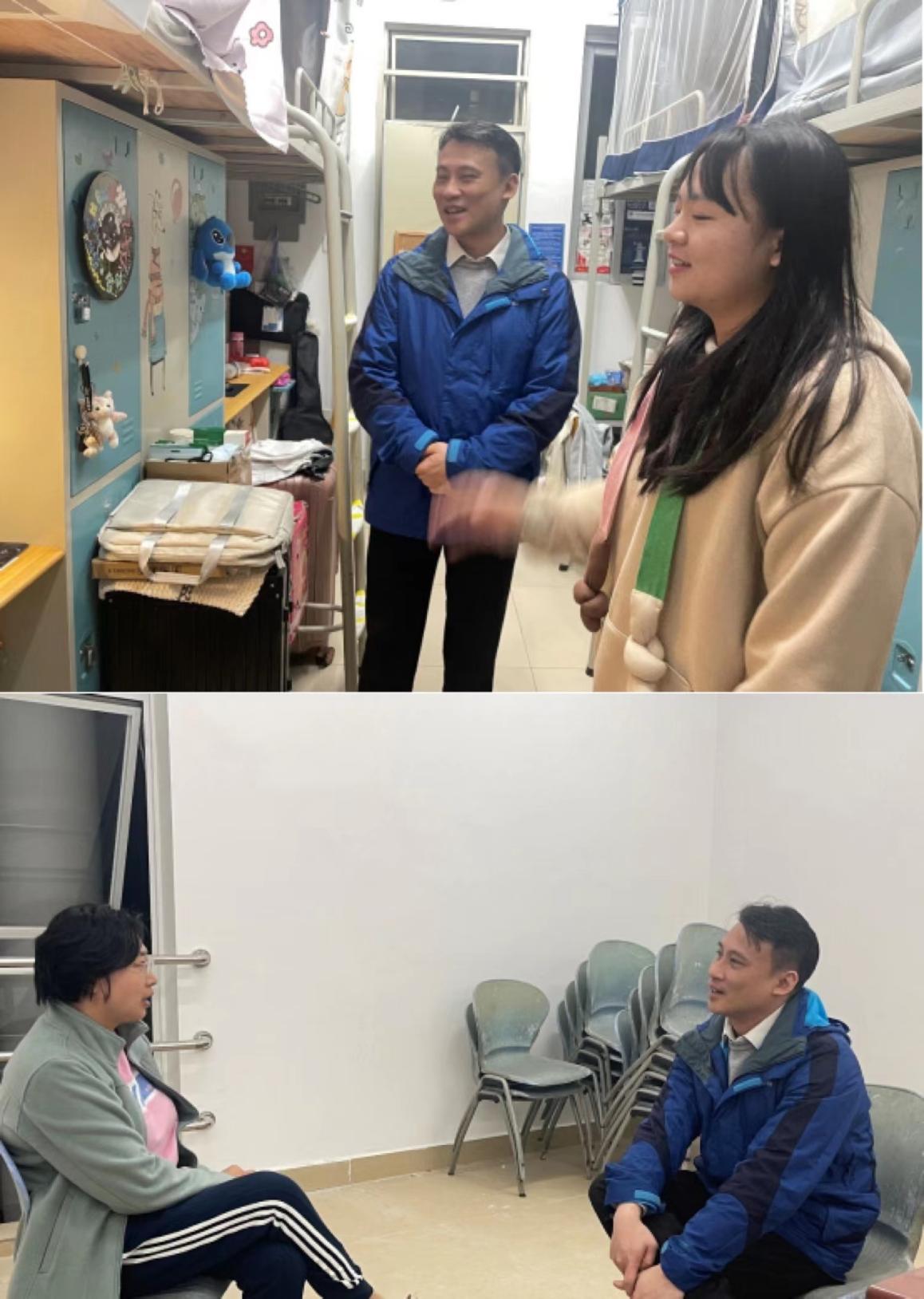曾锋老师利用值班时间走访6栋302、301学生宿舍,关心同学们日常生活,和同学们谈论有关升学与就业问题,指引学生做好毕业去向规划。