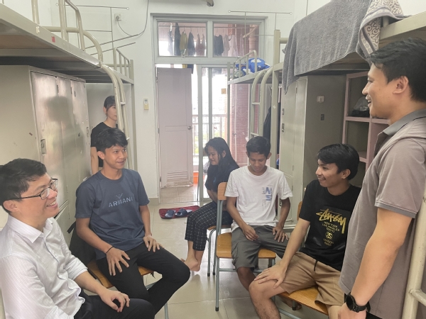 为落实高校立德树人的根本任务,推动高校“一站式”学生社区工作走深走实,了解留学生的思想动态、心理状况及宿舍安全卫生等情况,11月10日,学校党委委员、副校长徐勇军在机电工程学院党总支副书记梁超鹏等的陪同下深入“一站式”学生社区,走访留学生宿舍,与留学生进行座谈交流,倾听心声,共话成长。