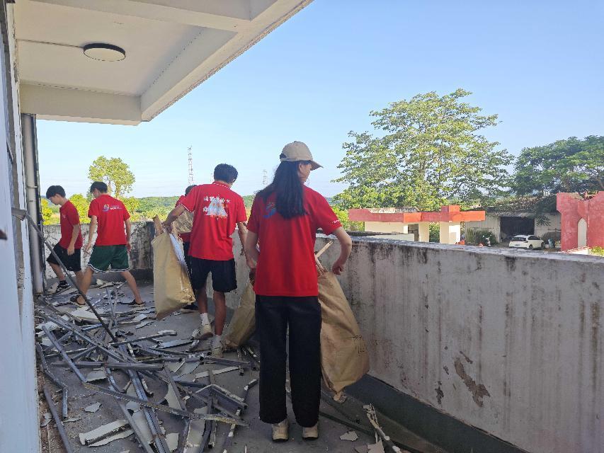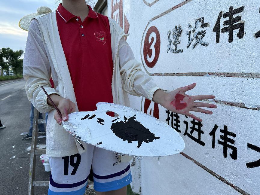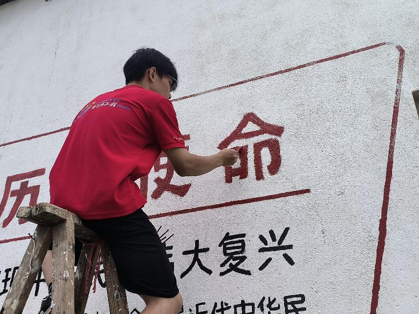 到达现场后,队员们没有片刻休息,立即投入到墙面的填色和修缮工作中。他们手持调色盘,细心地调配着每一抹色彩,确保每一笔都能精准地融入整体画面。随着画笔的轻轻挥洒,一幅幅生动有趣的图案逐渐在墙面上显现,为社区增添了一抹亮丽的色彩。同时,队员们也不忘将旁边的墙面进行细致粉刷,确保整体视觉效果和谐统一。随着时间的推移,气温逐渐升高,夏日的热情也愈发强烈。然而,这并没有丝毫影响队员们的工作热情。他们身穿统一的队服,头戴遮阳帽,在烈日下坚持工作。汗水浸湿了衣衫,但他们的眼神中却透露出坚定与执着。他们用自己的汗水和努力为乡村增添了一抹亮丽的色彩,也为自己的青春留下了难忘的记忆。