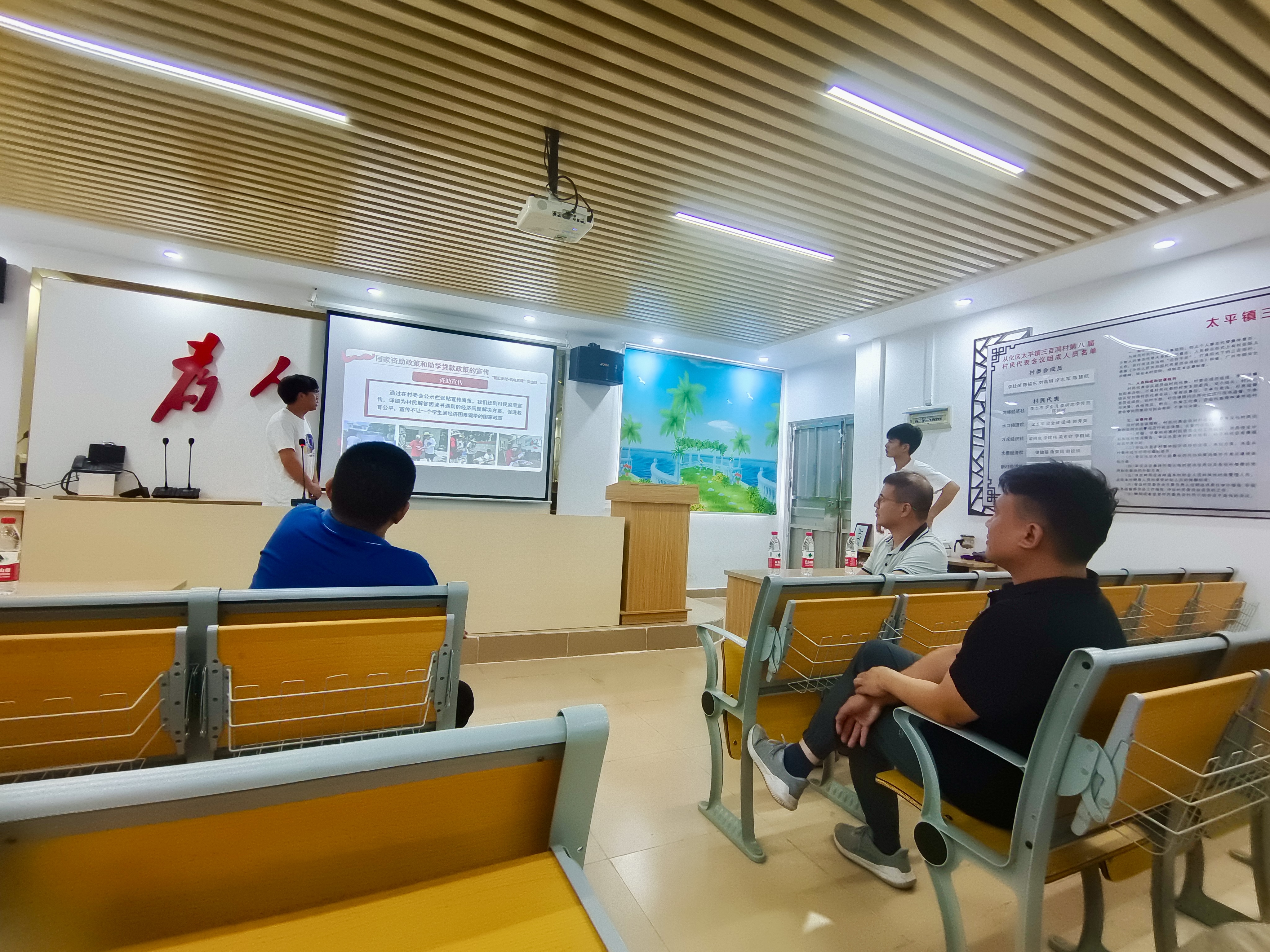 第二站前往从化太平镇三百洞村。对“智汇乡村·机电先锋”突击队的实践活动进行指导。首先,学校领导与三百洞村团委书记李志军同志一起进行暑期社会实践基地挂牌仪式,达成校地合作的共识,为实现帮扶乡村振兴常态化奠定坚实的基础。随后,学校领导与村委干部共同前往会议厅,认真聆听突击队暑期社会实践工作报告,并与村干部进行深入地合作方式交流。最后,参观突击队成员的居住环境及精心创作的乌榄主题墙绘作品。整个过程中,领导们对突击队展现出的专业素养和积极风貌表示了高度赞赏,并对突击队的工作开展进行详细的指导、提出可行性的建议。