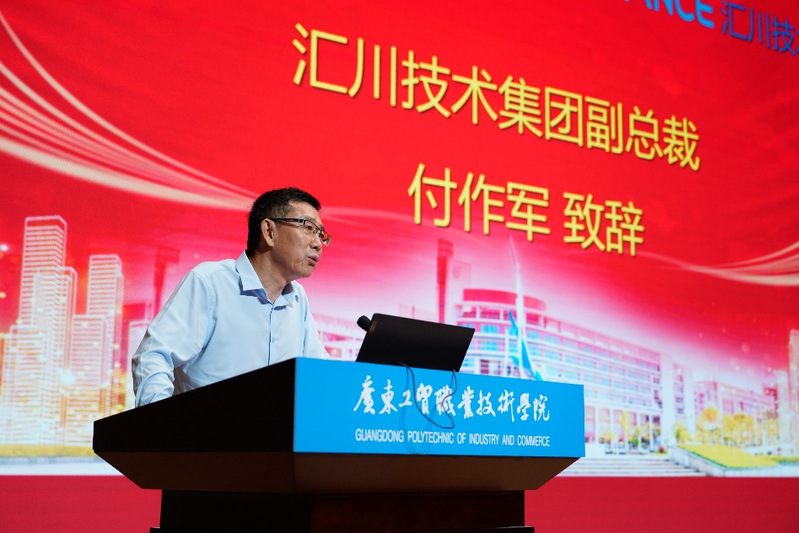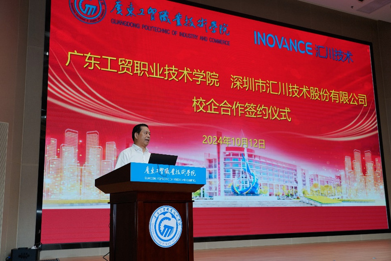 何汉武书记代表学校向出席仪式的企业领导及成员表示热烈欢迎,指出学校作为培养大国工匠、能工巧匠、高技能人才的主阵地,要深化产教融合,加强与行业龙头企业深圳市汇川技术股份有限公司合作办学、合作育人、合作就业和合作发展的四合作,推动学校办学能力再创新高。