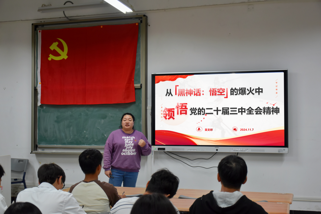 课上,吴文婷对本次党课内容的学习及实际情况向支部党员阐述《黑神话:悟空》高燃背后的文化自信与初心使命,其表示:《黑神话:悟空》的成功并非偶然,它不仅是一款优秀的游戏作品,更是文化传承、科技创新和民族品牌的集中体现,它与党的二十届三中全会精神相呼应,为我们提供了宝贵的启示和借鉴。作为新时代大学生党员,要积极践行党的二十届三中全会精神,积极探索创新发展之路,增强对民族文化的认同感和归属感。