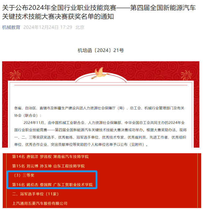 11月17—21日,由人力资源社会保障部、中国机械工业联合会、中华全国总工会共同主办的2024年全国行业职业技能竞赛——第四届全国新能源汽车关键技术技能大赛决赛在安徽省芜湖市举办,我院学生姚伦杰、蔡国辉代表广东队参加2024年全国行业职业技能竞赛--第四届新能源汽车关键技术技能大赛汽车检修工(智能载运综合技术方向)决赛,经过激烈角逐,获得国赛三等奖的好成绩(总教练:邵超城 指导团队:宋显文、卢伟明、贺静)。
