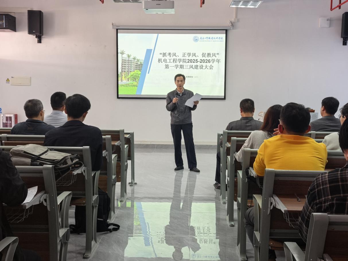 为深耕立德树人根本任务,锤炼高素质教师队伍,规范教育教学秩序,加速“双高建设计划”各项任务生根结果,2025年12月11日下午,机电工程学院于致知楼801召开全院教职工大会。会议由机电工程学院院长罗庚兴主持。