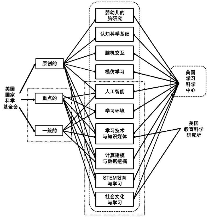 教育学的跨学科发展经历了三个重要阶段:第一个阶段是19世纪末20世纪初,教育学与心理学、统计学的交叉,产生了教育心理学、教育评价学、教育测量学等学科,使得教育学从思辨走向科学;第二阶段是20世纪60年代以后,教育学与经济学、社会学、公共政策学的结合,使得教育学从微观走向了宏观;第三阶段是21世纪以后,教育学与信息科学、计算机科学、脑科学、人工智能科学等正在进行的结合,产生了学习科学、教育神经科学等新学科、新领域,使教育学从单纯的社会科学走向了综合科学。这个过程经历了从学科间概念和理论的互借互换发展到学科间合作解决问题,又发展到在不同学科之间融通的综合理论,再发展到在独立的学科间共同交叠的部分开发新的领域。根据对美国国家科学基金会(National Science Foundation,NSF)、美国教育科学研究所(The Institute of Education Sciences,IES)、美国学习科学中心(Science Learning Center,SLC)三大科研资助机构近年来对教育科学资助的领域和项目分析发现,科研资助主要集中于如下十个方面:婴幼儿的脑研究、认知科学基础、脑机交互、模仿学习、人工智能、学习环境、学习技术与知识媒体、计算建模与数据挖掘、STEM教育与学习、社会文化与学习。④从这些资助的领域来看,教育学正呈现出与自然科学和工程技术相结合的新景象,正孕育着新的重大突破。(见下图)