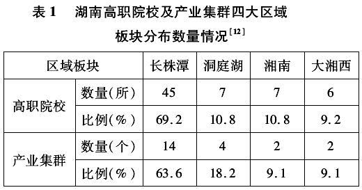 在全球产业结构和布局深度调整的背景下,产业集群模式必定会被各大企业广泛借鉴,高等职业院校的教学方式针对产业集群发展现状进行改革创新,是一种必然趋势。[10](1)从理论层面来看,产业集群知识溢出视角下,高等职业院校嵌入产业集群的必要性主要是提高与产业集群的地理临近性以充分吸收知识溢出的需要,以及有效服务产业集群中的企业充分吸收知识溢出的需要。[11](2)从实践角度来看,当前,我国很多区域都存在具有一定地区优势或特色的产业,已经具备形成产业集群的初始条件,并且相应区域的高等职业院校也初步具备了服务产业集群发展的基本条件。以湖南省产业集群和高等职业院校为例,湖南作为制造业强省,重点发展的20个产业集群主要集中在长株潭地区。目前,湖南共有65所高等职业院校,其中公办院校56所,民办院校9所。从学校和产业集群在四大区域板块的分布来看(见表1)[12],湖南重点产业集群和高等职业院校在四大区域板块的布局基本一致,为湖南高等职业院校有效对接各区域板块产业集群协同发展奠定了良好基础。