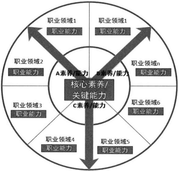1+X证书制度的特色在于“1”与“X”之间的协同配合。当“1”与“X”在组织、资源、时空、制度等宏观和中观层面实现整合后,两者协同的重心就应该是微观层面的整合,也就是如何在课程与教学层面实现整合。这里我们应该尝试检讨目前现行的“模块堆积式”的能力培养与课程体系设计思维,而考虑转向“同心圆式”的能力培养与课程体系设计思维。所谓“模块堆积式”的思维,指的是能力的培养是从公共能力到专项能力的堆积过程。在这一思维指导下的课程体系就是目前广泛采用的“公共课→专业基础课→专业核心课程→专业方向课→专业实训课”的课程设计模式。它的问题在于“专业能力”“方法能力”“社会能力”的培养是割裂的,无法找到一个有效的载体实现三者之间的整合。而“同心圆式”的思维强调能力的培养是核心素养(关键能力)到专项能力的交叉延伸过程(如图1)。核心素养(关键能力)的培养为职业领域专项能力的形成提供了基础,而专项能力的形成又反过来促进核心素养(关键能力)的巩固和内容丰富。当我们以“核心”“关键”等词形容职业能力时,不能忽视一个基本前提,那就是职业能力体现在真实工作任务完成的细节。核心素养(关键能力)与专业能力的形成是齐头并进、相互交融和促进的。在这一思维指导下的课程体系应该是“矩阵式的课程体系”,即由核心素养与职业领域(工作任务)交叉形成的课程体系模式。在这样的课程体系模式下,学历教育能够真正成为促进职业能力发展的基础,可持续发展能力能够真正为职业生涯的发展服务,学历证书能够真正与职业技能等级证书形成合力。