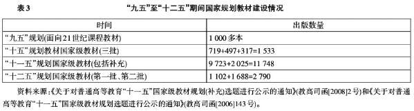 其二,抓好重点教材,实施精品教材战略。国家教委在1994年制定了《面向21世纪教学内容和课程体系改革计划》,(以下简称“改革计划”)准备像国家抓重点科研项目一样,组织全国各学科骨干力量,对高等教育本科主要的一些专业的基础课、核心课和专业基础课进行有组织有计划改革。[16]从1995-2002年,高等教育出版社共推出“面向21世纪课程教材”1 000多本。从“九五”到“十二五”,教育部组织评选国家级规划教材16 000多本,除此之外,教育部还组织评选年度精品教材,2007年度精品教材218种,2008年292种,2009年209种。(见表3)