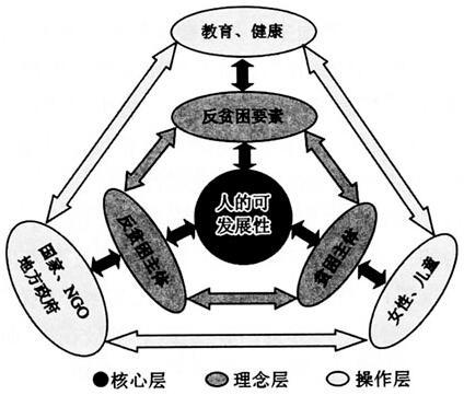 其次是三个层次,即表层、中层与里层。表层为操作层,主要涉及反贫困关联主体和要素,包括教育和健康、国家地方政府和非政府组织,以及儿童和女性。中层是表层的概念化,将教育和健康概念化为反贫困要素,将国家、地方政府和非政府组织概念化为贫困外部主体,将儿童和女性概念化为贫困内部主体。反贫困要素是贫困内部主体和贫困外部主体互动的载体。里层是以人的可持续发展为核心的理念层,这是国际反贫困研究的基本前提,也是贯穿所有反贫困研究的主线。