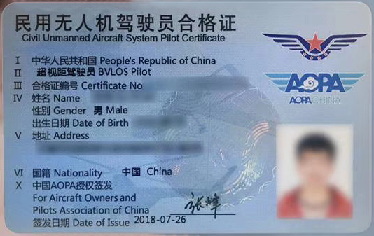民航局无人机驾驶执照、AOPA证书样板: