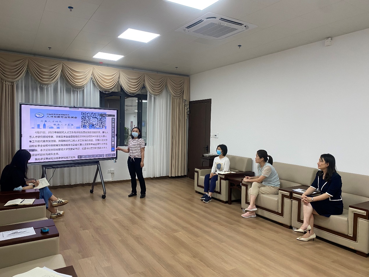 会议学习现场 首先,杨慧同志带领大家观看了《学习贯彻习近平新时代中国特色社会主义思想主题教育工作会议在京召开 习近平发表重要讲话》的视频。支部成员观看后表示,要用习近平新时代中国特色社会主义思想凝心铸魂,筑牢根本,在思想上政治上行动上同党中央保持高度一致。 接着,杨慧同志向支部成员传达学校召开学习贯彻习近平新时代中国特色社会主义思想主题教育工作会议精神。重点强调何汉武校长提出的三个要求:一是要深刻领会开展主题教育的重大意义,以高度的政治自觉、饱满的政治热情、严肃的政治态度,积极投身主题教育;二是要准确把握主题教育的目标要求,按照学思想、强党性、重实践、建新功的总要求和凝心铸魂筑牢根本、锤炼品格强化忠诚、实干担当促进发展、践行宗旨为民造福、廉洁奉公树立新风的具体目标;三是层层压实责任,加强组织领导,强化督促指导,力戒形式主义,确保主题教育取得扎实成效。 学习结束后,人事处副处长李文菁和人事科科长李惠红分享两人在4月21日参加新时代人才工作与评价改革论坛的心得体会。李惠红同志表示:“未来人才评价改革应更关注过程性评价,今后我们要发挥职称评审中的同行评议和专家评审作用,给申报者提出更多学术发展方向、研究方法等建议。” 李文菁同志表示:“在人才引进方面,我们学校需要向本科高校学习主动出击,各二级学院在人才引进中要主动谋划,要与专业建设、学校发展建立紧密关联度;此外,学校要勇于突破,向标杆本科院校学习在人才评价及聘用方面真正“破五唯”。同时,建议我们全体同志在今后的工作中要进行精华式的总结。”