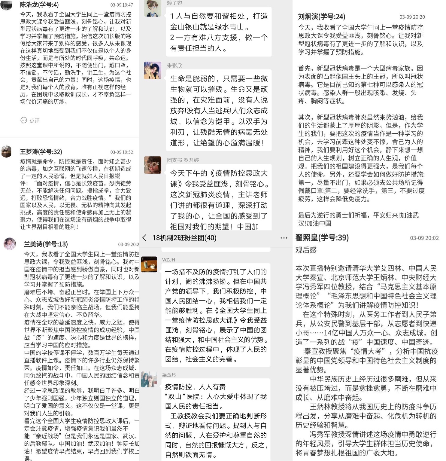 为贯彻落实教育部社科司关于组织“全国大学生同上一堂疫情防控思政大课”的通知要求,引导广大学生增强“四个意识”、坚定“四个自信”、做到“两个维护”,坚定在以习近平同志为核心的党中央坚强领导下打赢这场疫情防控人民战争、总体战、阻击战的信心和决心,3月9日下午,马克思主义学院组织全体思政课教师和7108名学生通过人民网教育频道、人民网人民智云客户端、咪咕视频客户端等同步收看了这堂“思政大课”的网络直播,因其他原因未能观看直播的学生也于当日晚上进行了回看学习,师生们讨论热烈,在微信群、QQ群等平台上纷纷分享自己的观看心得。