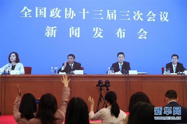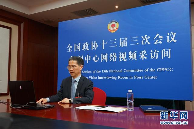 5月21日,在北京人民大会堂新闻发布厅举行全国政协十三届三次会议第一场“委员通道”采访活动。这是全国政协委员王辰通过网络视频方式接受媒体采访。 新华社记者 刘金海 摄
