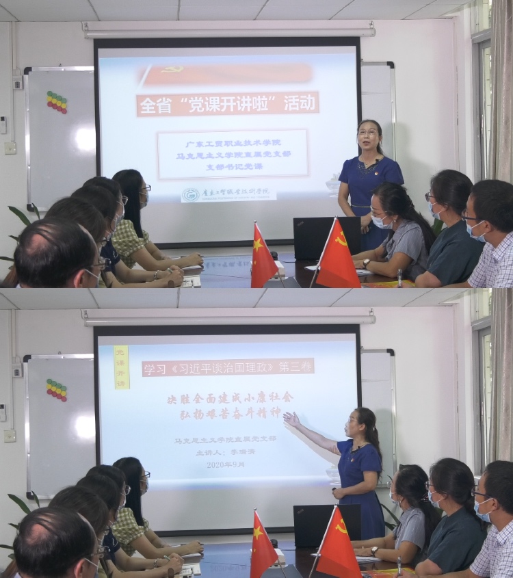 为贯彻落实广东省委组织部《关于印发<全省“党课开讲啦”活动实施方案>的通知》要求和学校组织部的部署安排,结合部门党建工作实际,发挥好、利用好讲党课这一党的组织生活制度,9月24日,马院直属党支部书记、马院常务副院长李瑞清为大家讲了题为《决胜全面建成小康社会弘扬艰苦奋斗精神》的主题党课,全体教职工党员参加了学习。
