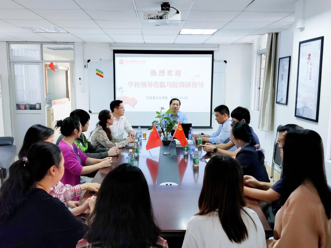 10月20日下午,学校党委副书记、校长何汉武、党委委员、副校长唐毓秋、党委委员、副校长刘贻新到马克思主义学院调研并指导工作,马院常务副院长李瑞清、副院长丁妙珍和部分教师代表参加了调研座谈。