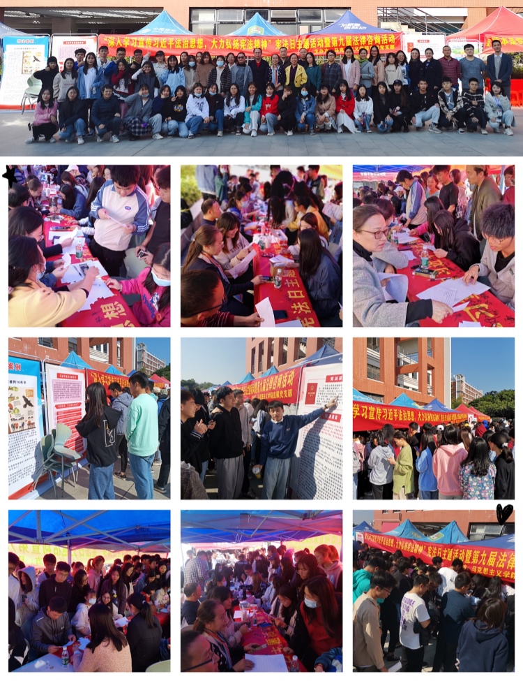 12月8日,在第九届法律咨询活动的现场,马院老师们将宪法简介、习近平法治思想介绍及相关案例解析通过展板展示出来,供学生们浏览和学习。有关宪法知识的一百道选择题被事先制作成纸条放在咨询现场,由学生们随机抽答,并对表现优越者给予相应奖励。学生们参加答题和咨询的热情很高,不少学生结合自己在学习、生活和工作中的各种疑惑和法律纠纷现场咨询老师,针对学生提出的问题,老师们都耐心地进行解答,并提出相应的建议。整场活动气氛热烈,迅速地在同学们当中掀起了学习宪法知识的热潮。